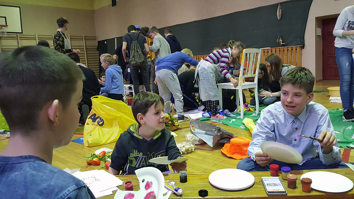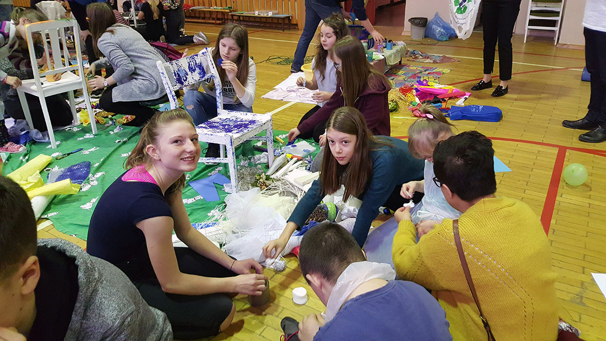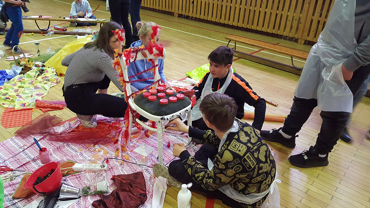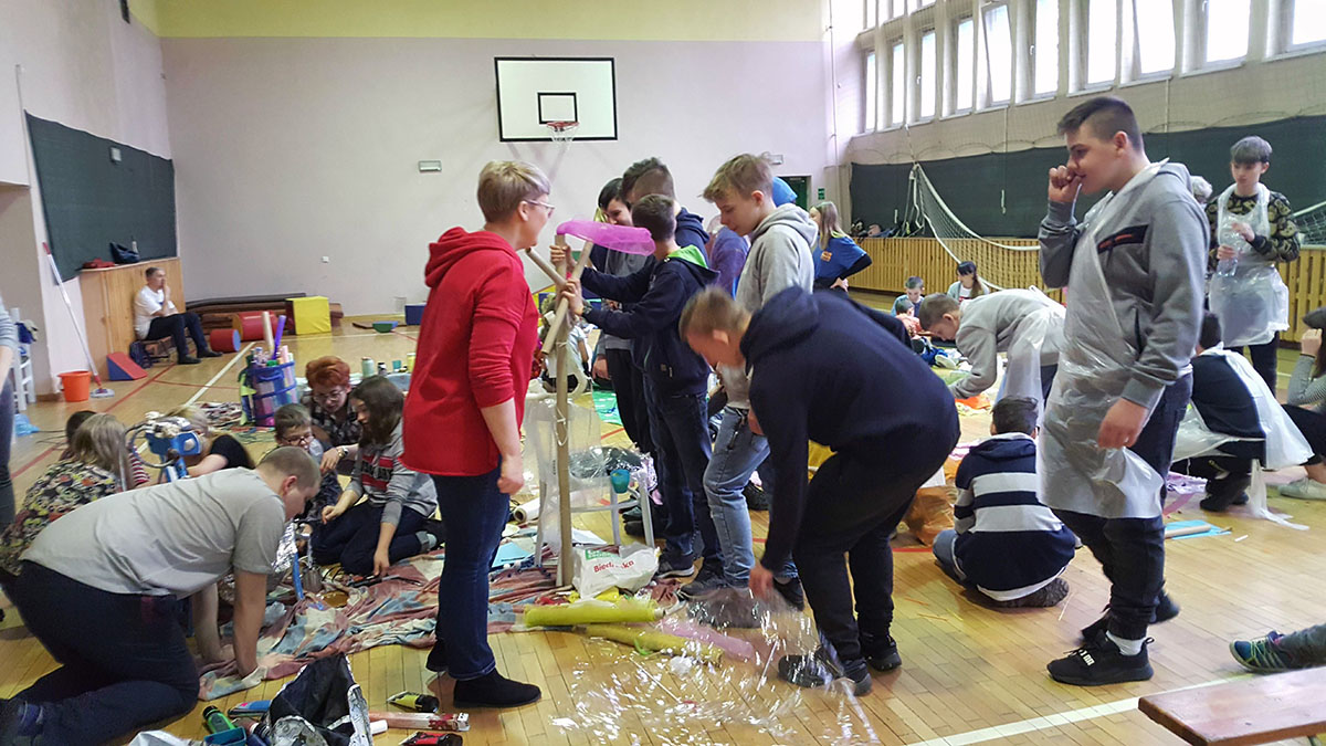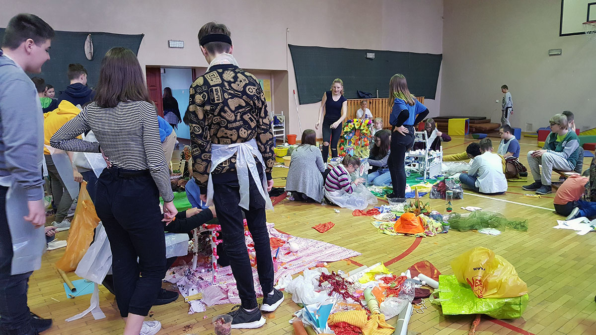 Wraz z uczniami Szkoły Podstawowej Nr 6 im. Marii Curie- Skłodowskiej i Szkoły Podstawowej Nr 15 im. Ks. Jana Dzierżona w Zabrzu nasi uczniowie podczas warsztatów integracyjnych wykonali instalacje pt.: „Cztery pory roku” oraz „Cztery żywioły”.