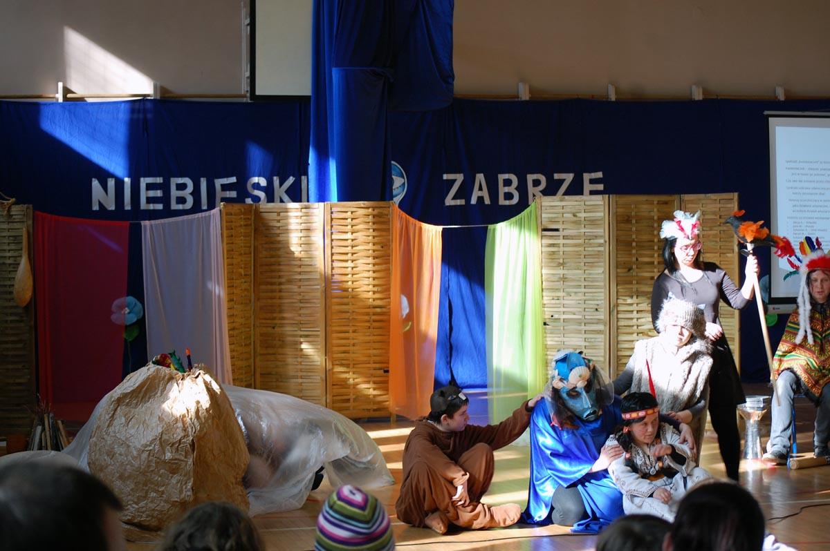 "Kamyczek" to indiańska opowieść, stara legenda, którą postanowili ukazać w nowy sposób terapeuci teatralni naszego szkolnego teatru "Rzepka"". Zaangażowani aktorzy to nasi uczniowie oraz nauczyciele ZSS nr 41 i uczniowie z zaprzyjaźnionego gimnazjum w Gliwicach. Odgrywanie roli jest również terapią. Ogromne brawa dla naszych uczniów, którzy występują przed tak ogromną publicznością bez tremy i skrępowania, chyba każdy z nas zdaje sobie sprawę jak trudne są wystąpienia publiczne.
