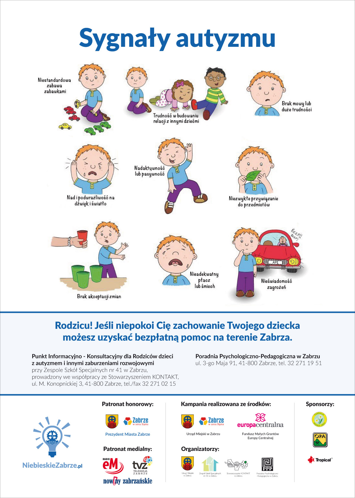 W ramach kampanii Niebieskie Zabrze organizatorzy przygotowali plakat informacyjny dotyczący pierwszych objawów autyzmu. Został on przekazany do wszystkich przedszkoli oraz oddziałów szkolno przedszkolnych na terenie miasta Zabrze oraz wybranych placówek zdrowia.